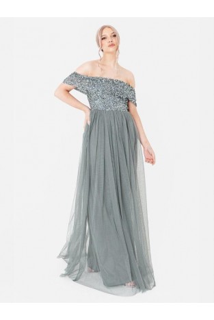 La Qayara Off-Shoulder Sequin Embellished Georgette & Soft Net Maxi Dress