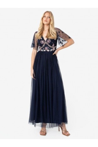 La Qayara Navy Blue Floral Sequin Embroidered Georgette & Soft Net Maxi Dress with Sheer Dot Sleeves
