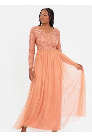 La Qayara Dusty Peach Sequin Embellished V-Neck Georgette Maxi Dress with Soft Net Skirt