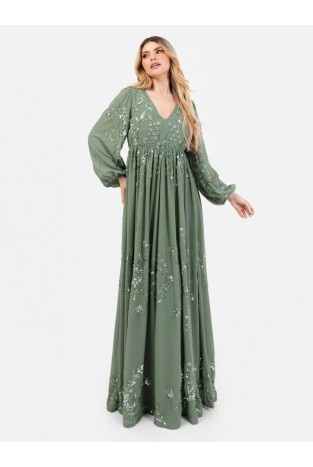 La Qayara Sage Green Georgette Maxi Dress with Floral Sequin & Bead Work and Bishop Sleeves