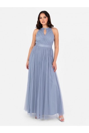 La Qayara Slate Blue Pleated Georgette Maxi Dress with Soft Net Overlay & Keyhole Detail