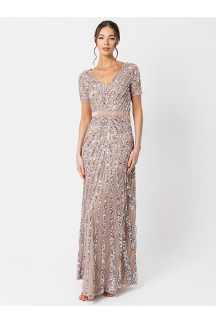 La Qayara Taupe Blush Chevron Sequin Embellished Georgette Maxi Dress with Soft Net Overlay